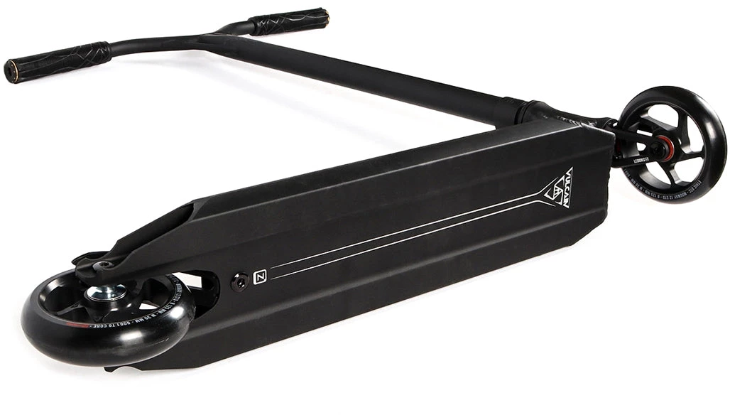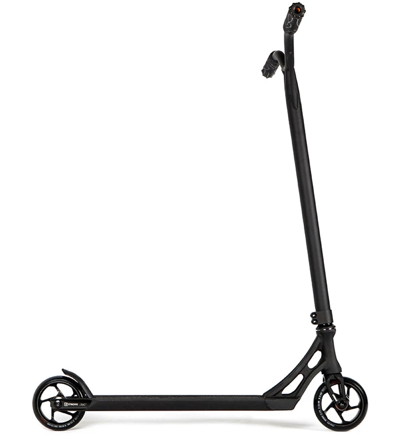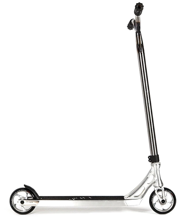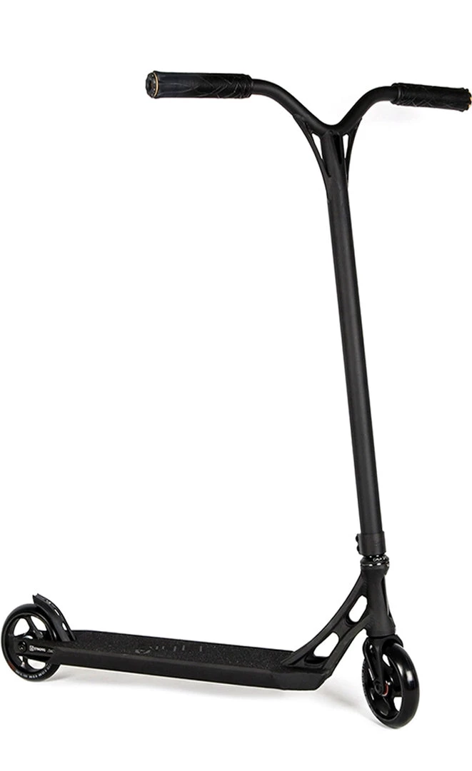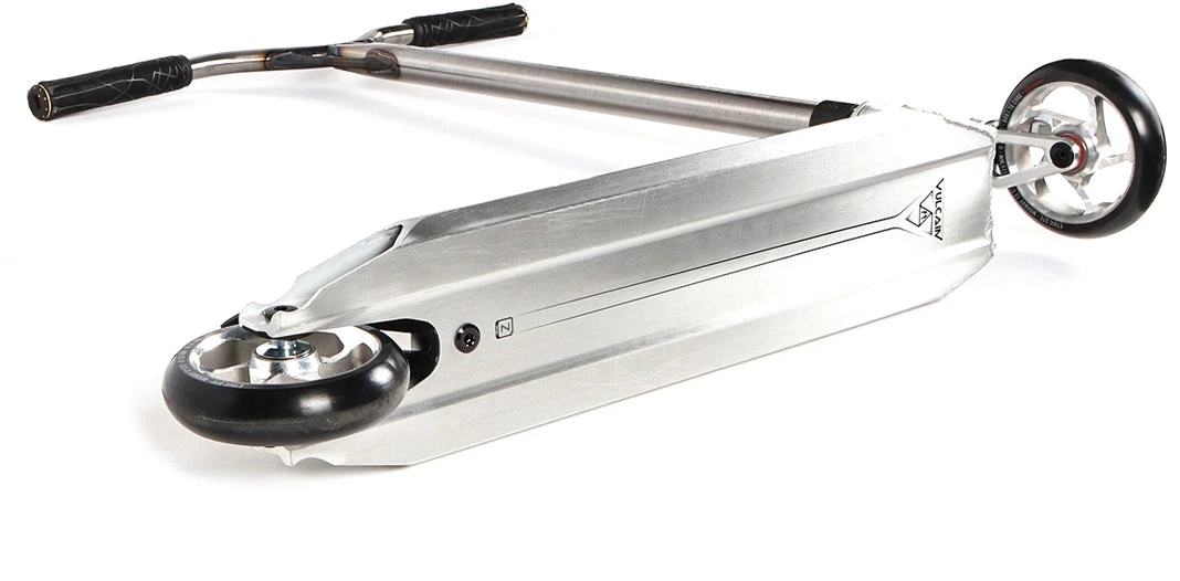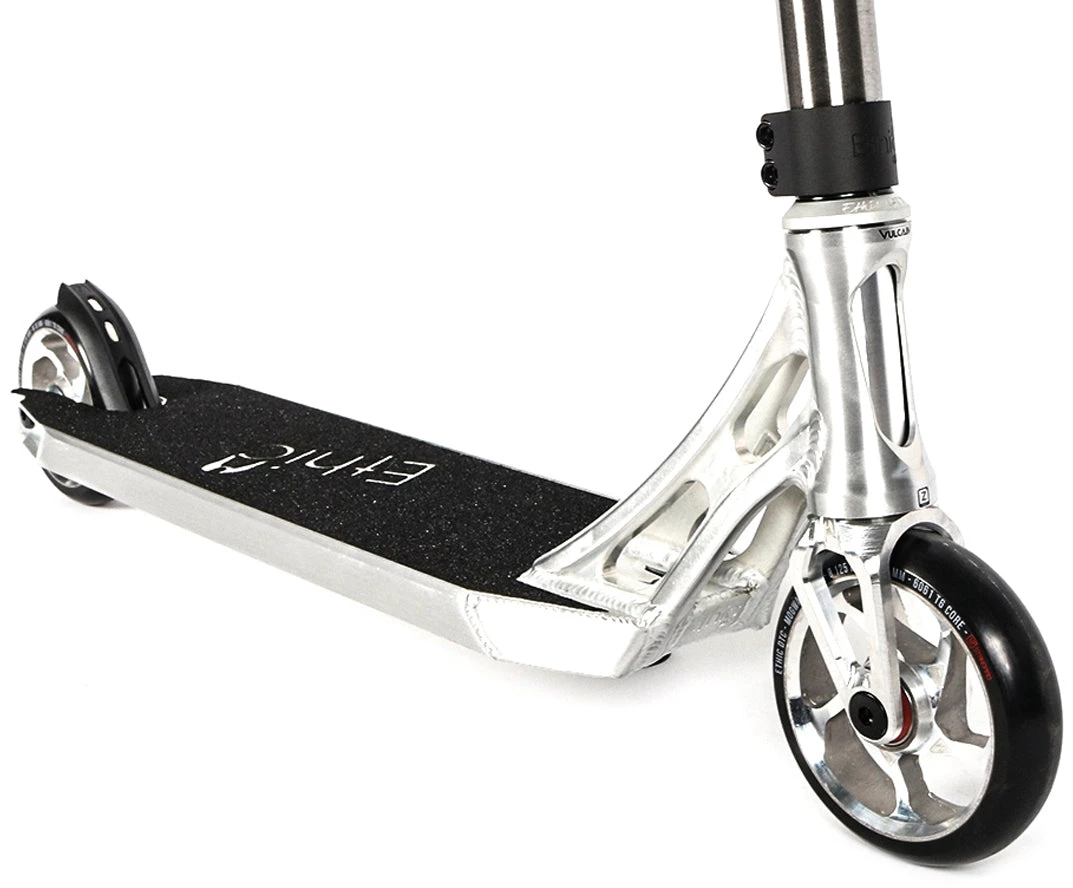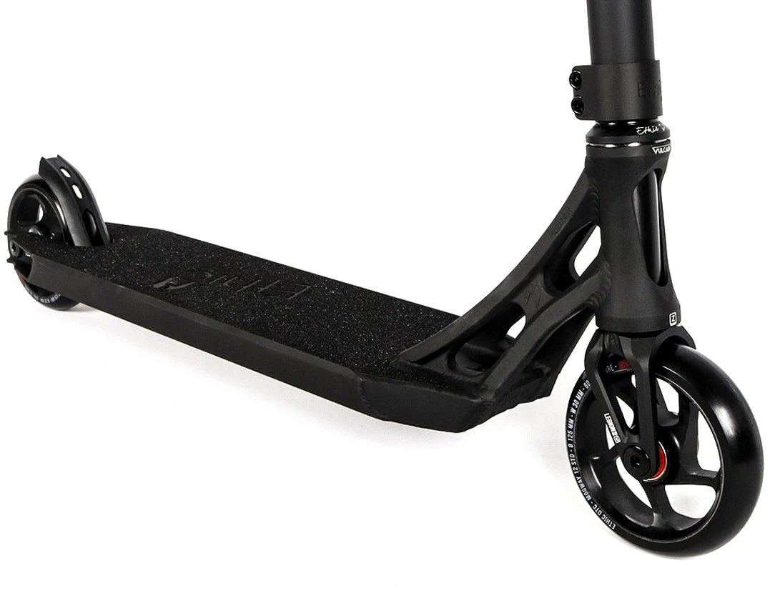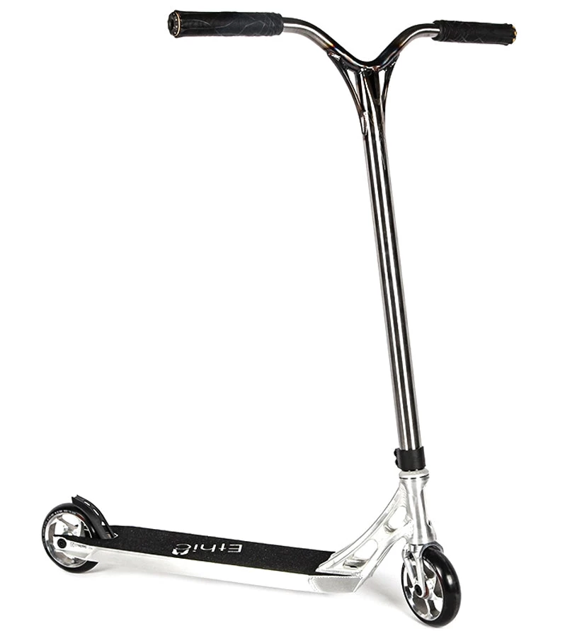 The Ethic Vulcain scooter is not for the faint of heart. This scooter is a beast. It has a 5.1″ x 22″ deck, tall chromoly bars, HIC compression system and of course….12 standard 125mm wheels. This complete is sure to get eyes at any skatepark you go to. The 12 standard wheels are becoming more and more popular as time goes on due to their durability and speed factors. The large bearing diameter allows for more pressure to be disbursed making larger drops more possible beings that your bearings won’t explode on impact. If you are a rider that is hard on your scoot, without a doubt…..this is the scooter for you.Â