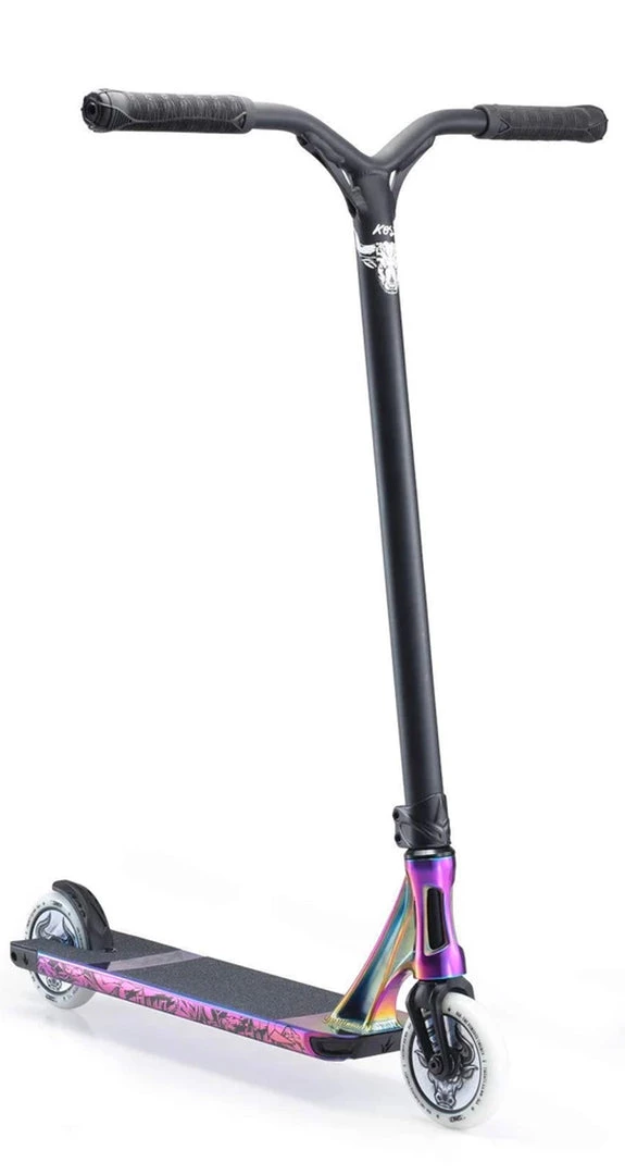 The Envy KOS Charge is the choice for many advanced level riders as it is comprised of Envy’s top of the line products. This scooter features aluminum reaper-style bars, TPR grips, IHC compression, Envy forged clamp, the KOS Charge oil slick deck, 120mm x 26mm wheels, ABEC9 bearings as well as a lightweight nylon brake. If you’re one to grind more than the average rider and struggle to lock in to grinds consistently, the Heist includes the boxed ends which help a TON when it comes to locking in and sliding further. This scooter is great for both skatepark and street terrains, so if you’re looking to up your game, grab an Envy KOS Charge today!
