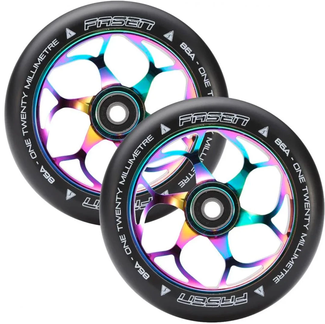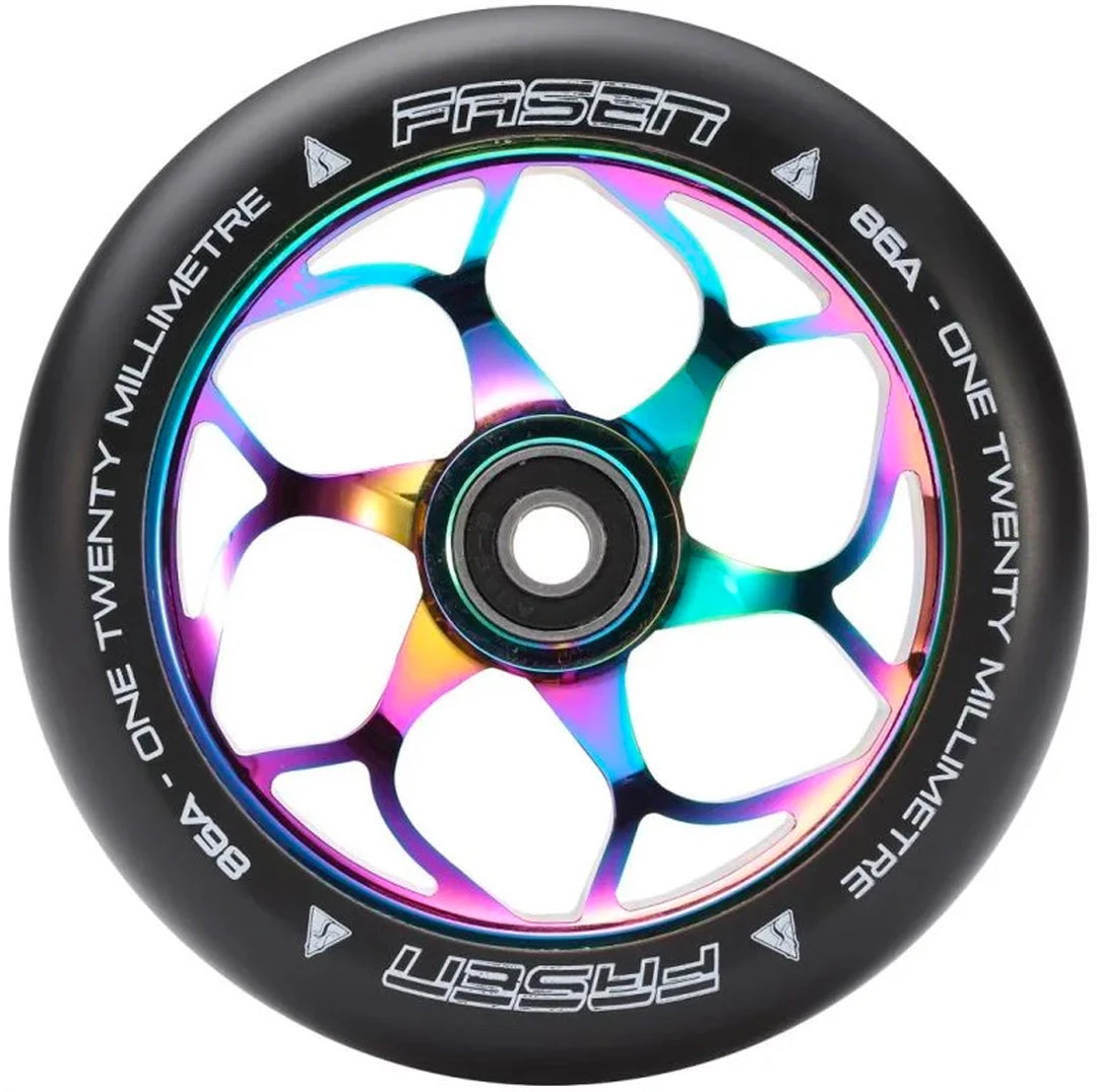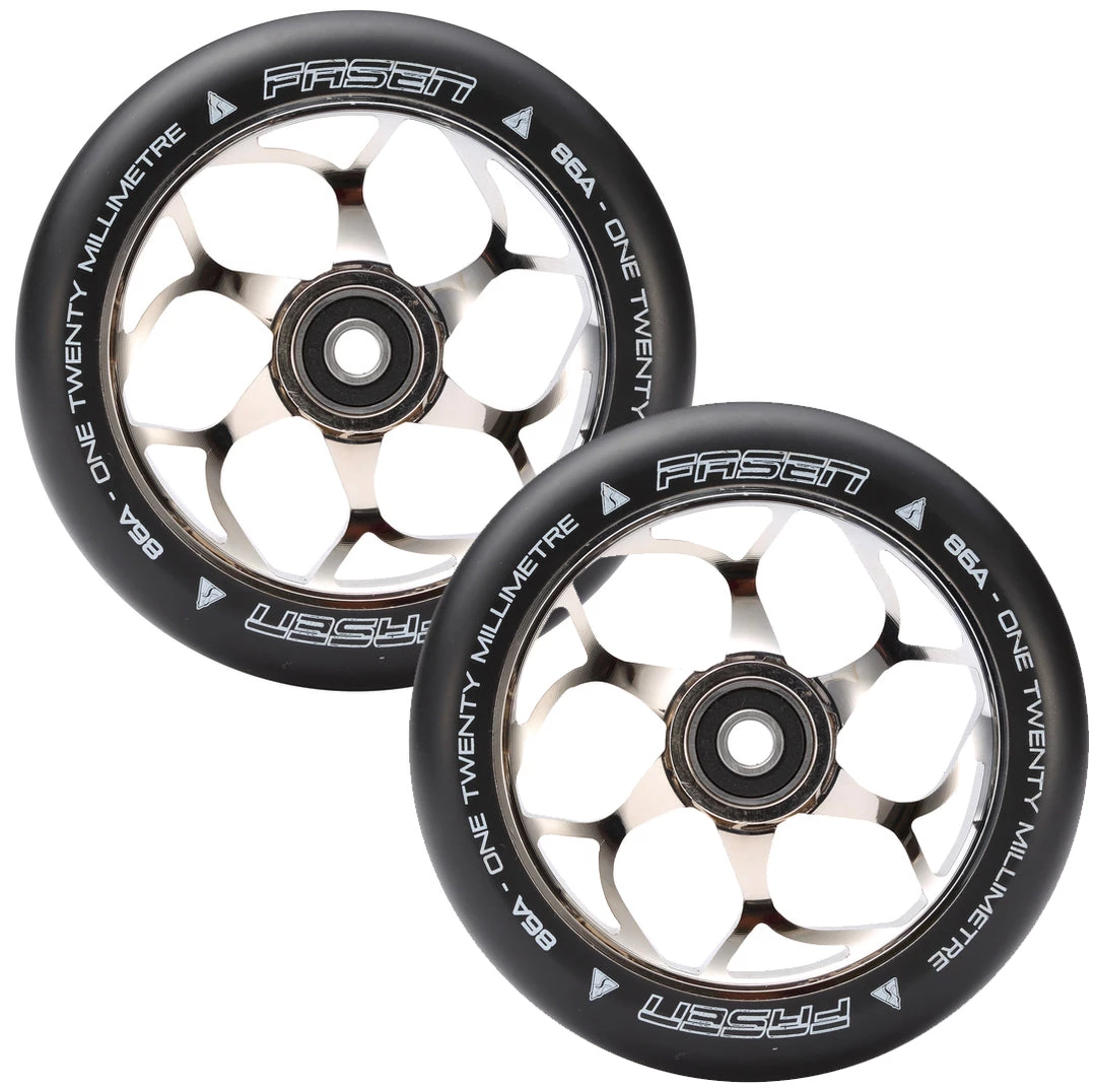The Fasen 6 spoke 120mm wheels are some incredible looking and riding scooter wheels. Fasen made sure to focus on a few different things with these wheels including speed, durability and of course looks. These wheels are available in oil slick, burnt pipe, polished and black core color ways. The burnt pipe option is a definite favorite of ours as there aren’t many burnt pipe wheels out there. If you want to stand out at the park amongst your friends and other scooter riders, check out the Fasen 6 spoke 120mm wheels today!