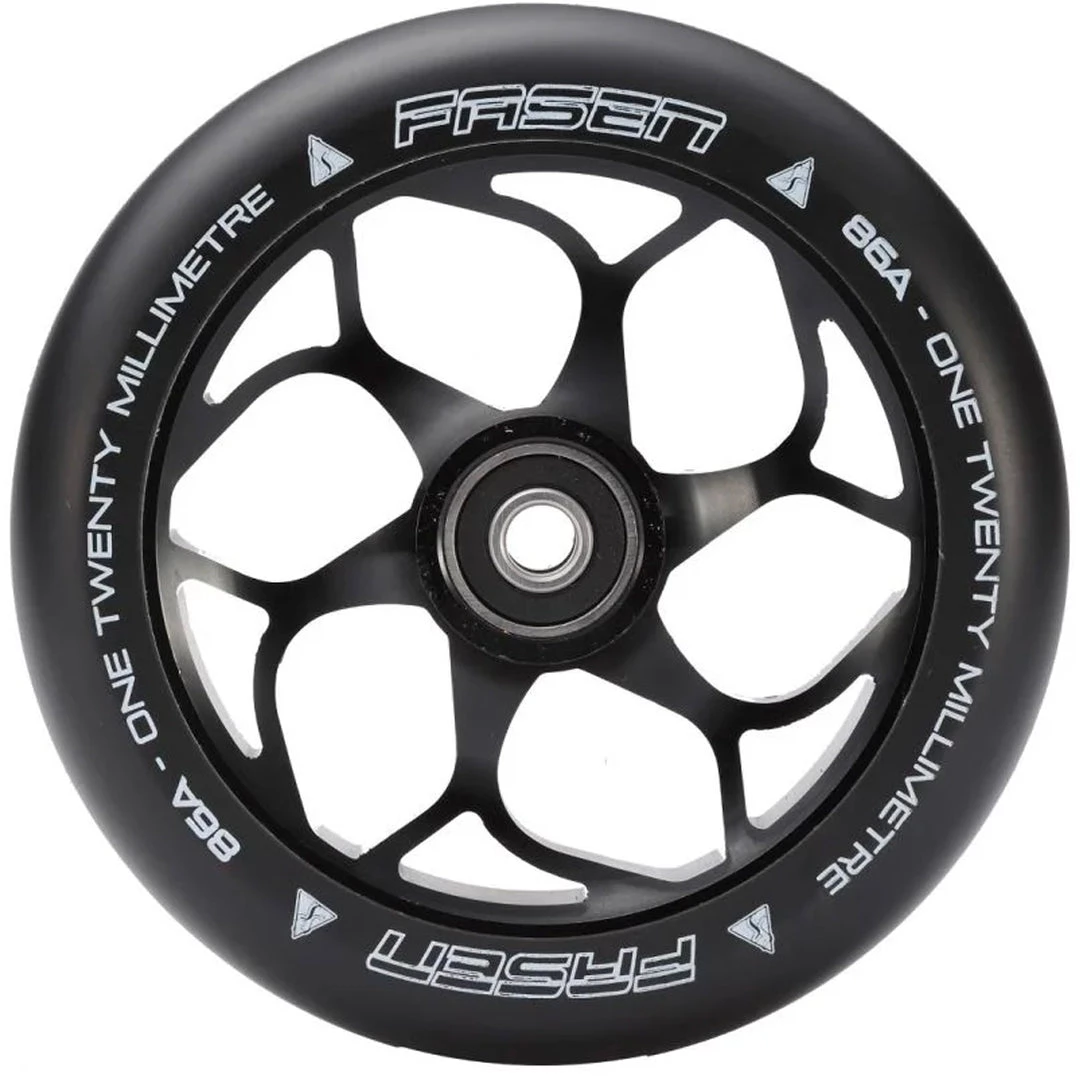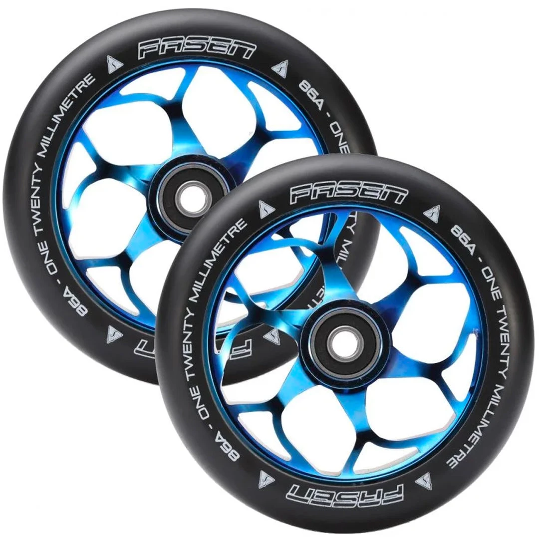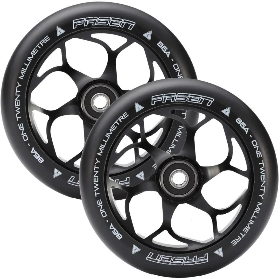 The Fasen 6 spoke 120mm wheels are some incredible looking and riding scooter wheels. Fasen made sure to focus on a few different things with these wheels including speed, durability and of course looks. These wheels are available in oil slick, burnt pipe, polished and black core color ways. The burnt pipe option is a definite favorite of ours as there aren’t many burnt pipe wheels out there. If you want to stand out at the park amongst your friends and other scooter riders, check out the Fasen 6 spoke 120mm wheels today!