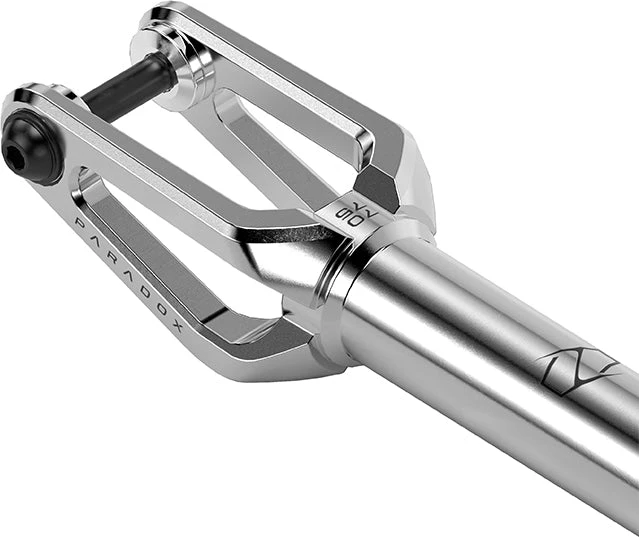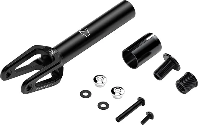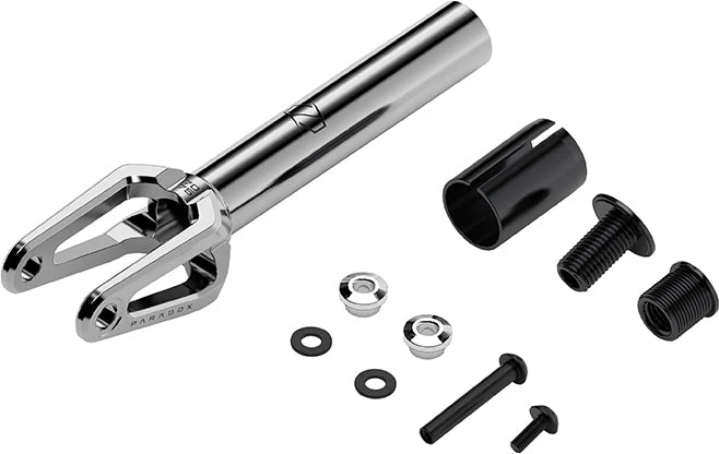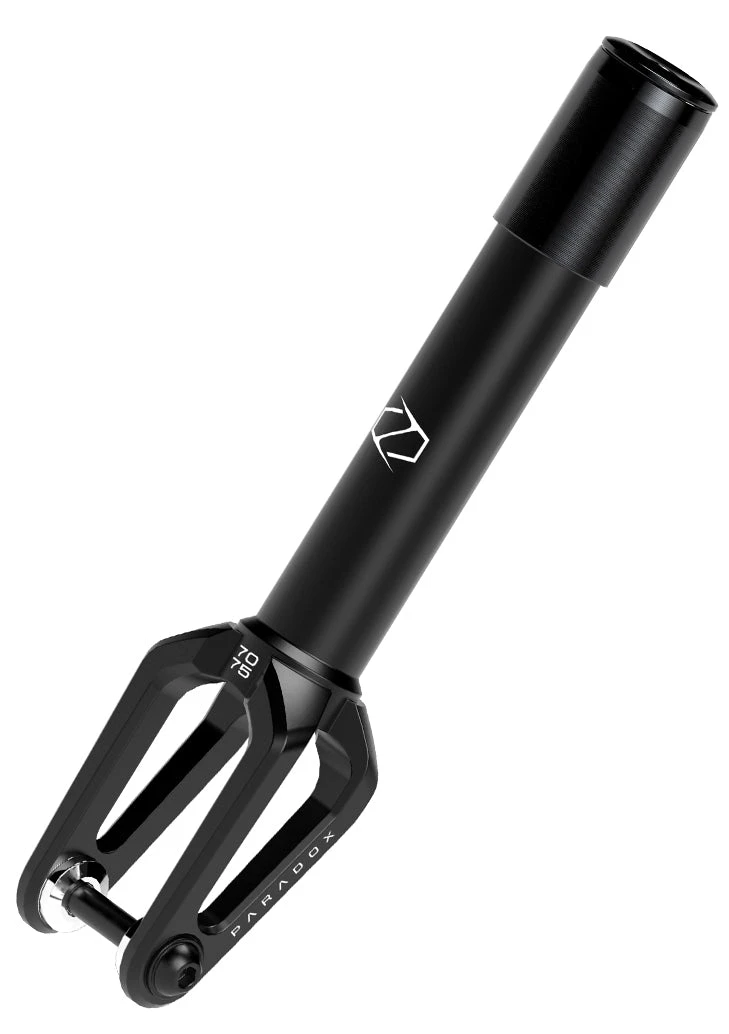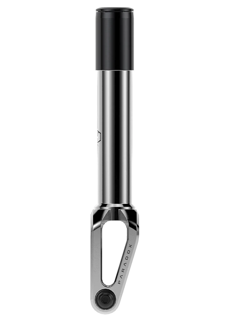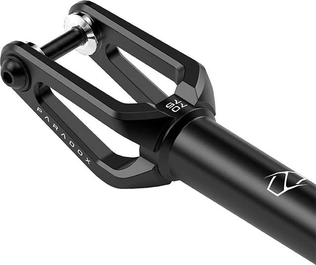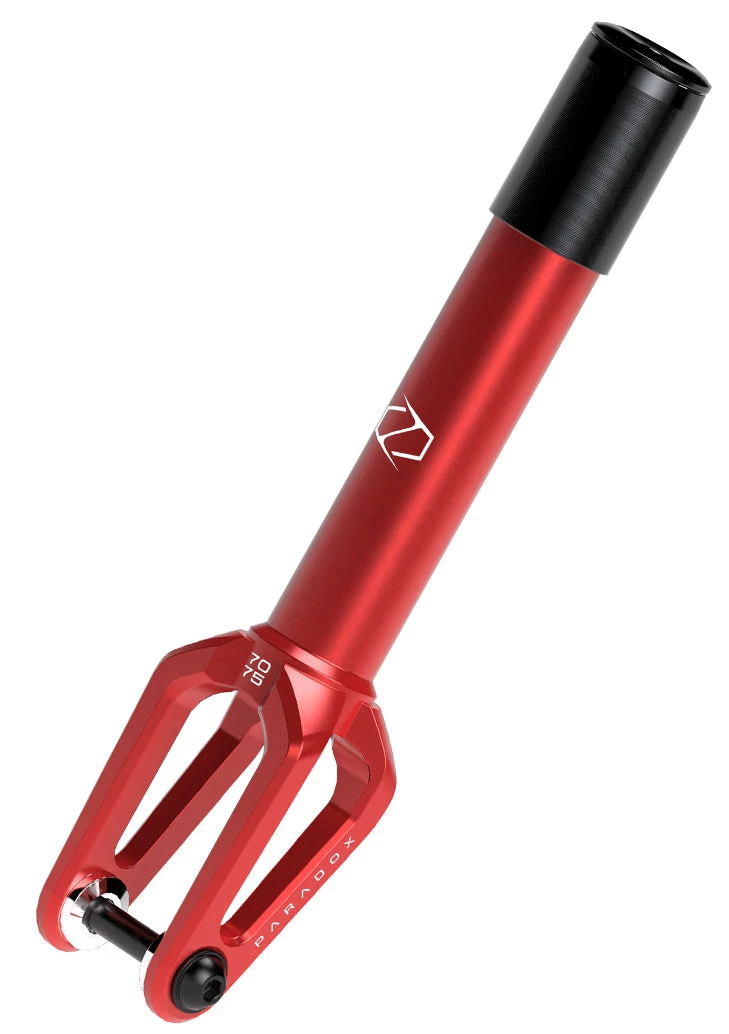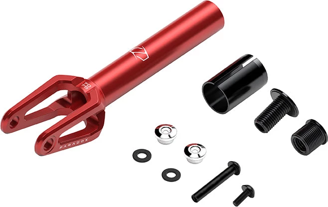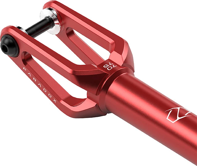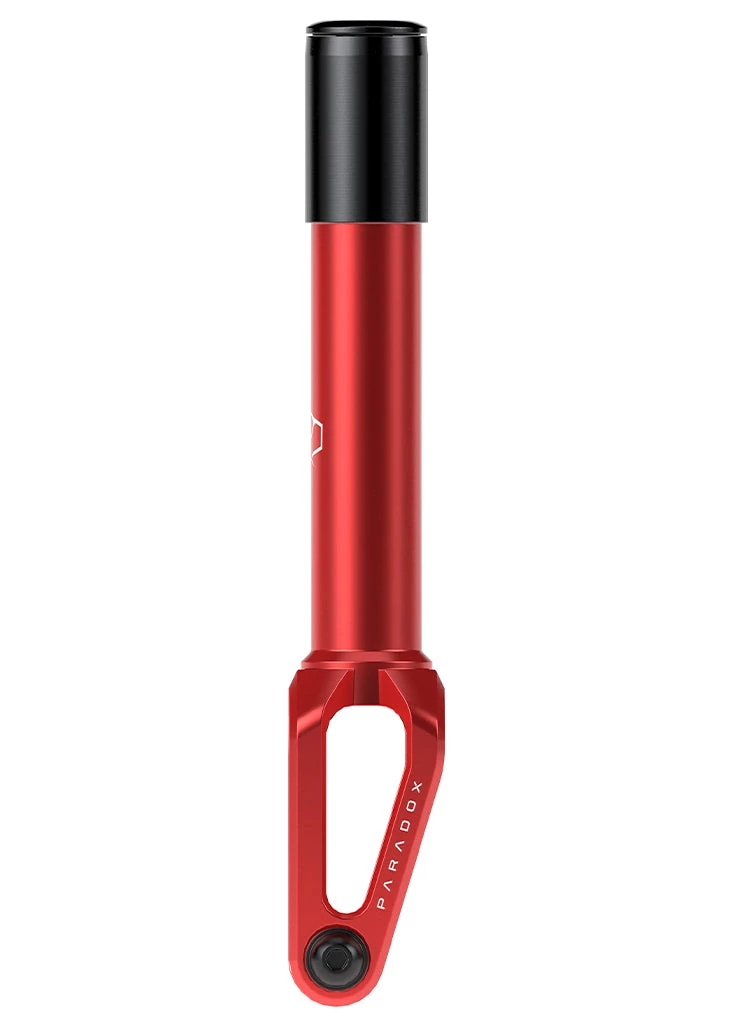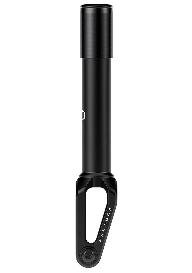 The Fuzion Paradox fork is one of the most versatile forks in scootering today. This fork is compatible with just about every wheel you can throw at it including 110mm x 24mm up to 120mm x 30mm. This fork is available in matte black, anodized red and raw color ways. This fork is compatible with HIC & SCS compression only. Grab yours today at Scooter Zone.