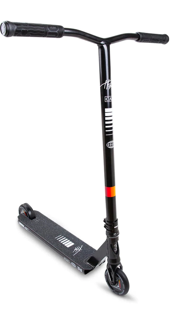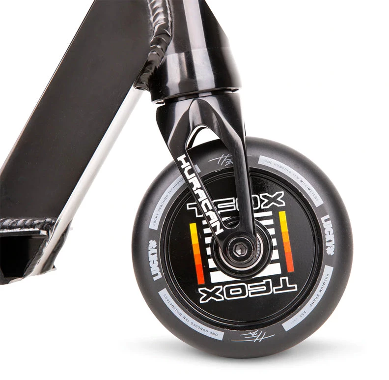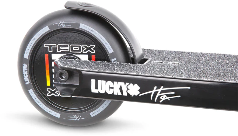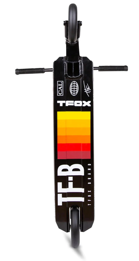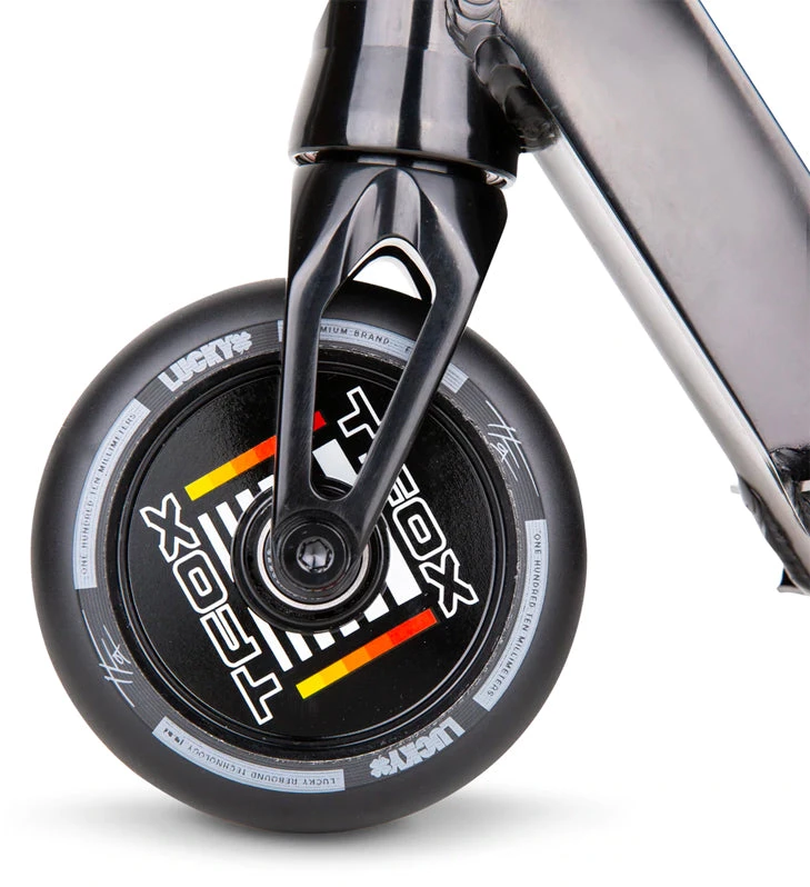 The 2021 TFOX Sig Complete uses the same deck as the legendary Prospect™ made from aircraft grade 6061 aluminum that gets hit with a robotic TIG weld for exceptional strength and durability. The deck is 19.5” (495mm) Long and 4.5” (114mm) with 4130 Chromoly Kink Bars that are 24” (610mm) Tall and 23” Wide (584mm). A Black anodized Huracan™ HIC fork and Lucky’s Lunar hollow core wheels that ties it all together. The graphics were inspired and designed directly with Tanner Fox to show off his favorite styling and color combos. If you want to support Tanner Fox and everything he’s about, grab a Tanner Fox Analog Complete Scooter here at Scooter Zone today!
