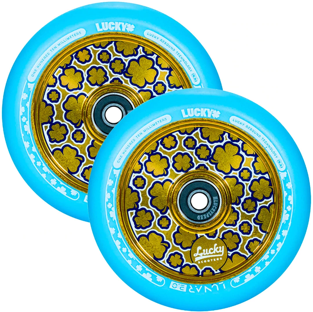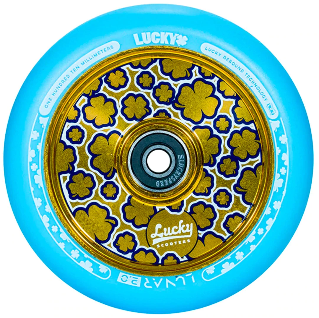 The Lucky Lunar 110mm hollow core scooter wheel is the newest and lightest wheel in the Lucky wheel quiver. They feature Lucky Rebound Technology, a combination of high-performance urethane, a new pouring process, and a proprietary curing method which gives these wheels a grippy, fast, and buttery roll. This particular Lunar wheel is the Cloverfield wheel which features a light blue wheel urethane and an anodized gold core with repeated lucky clover logos throughout. Get yours today here at Scooter Zone!