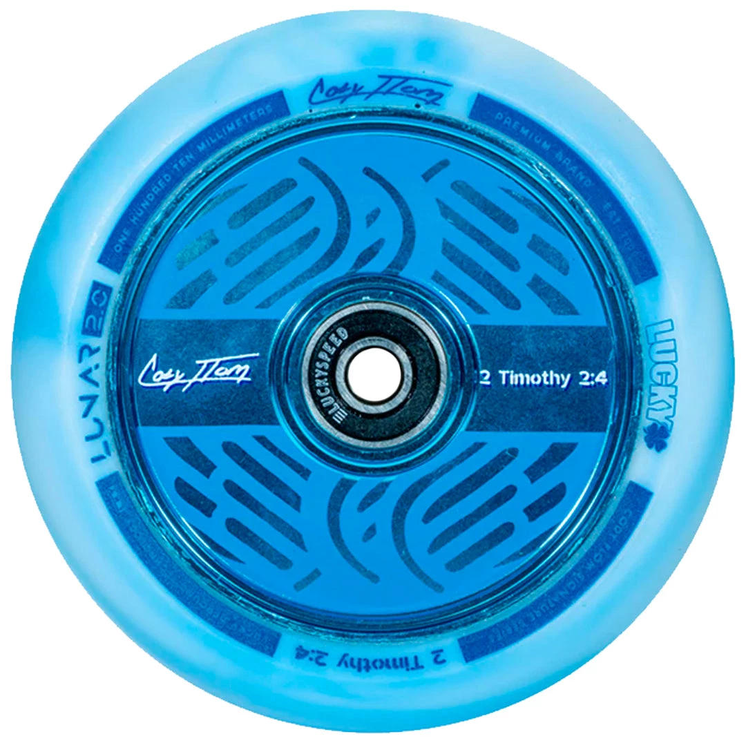 Cody Flom is one of the most gifted scooter riders in the sport today. Cody can do just about any trick you can think of with ease and cleanliness. These wheels are a great representation of Cody. Everything from the classic hollow core design, one of Cody’s favorite bible verses printed on the blue/blue swirl urethane & of course a high speed ABEC9 Lucky bearing. If you are a fan of Cody’s and you want to support the man himself, grab a set of the Lucky Lunar Cody Flom V4 signature wheels today at Scooter Zone!
