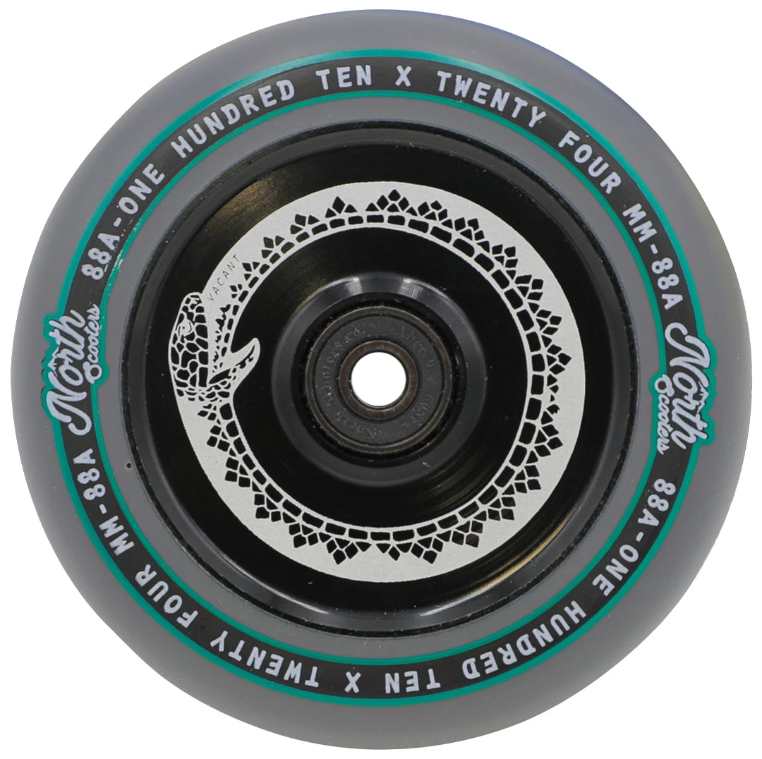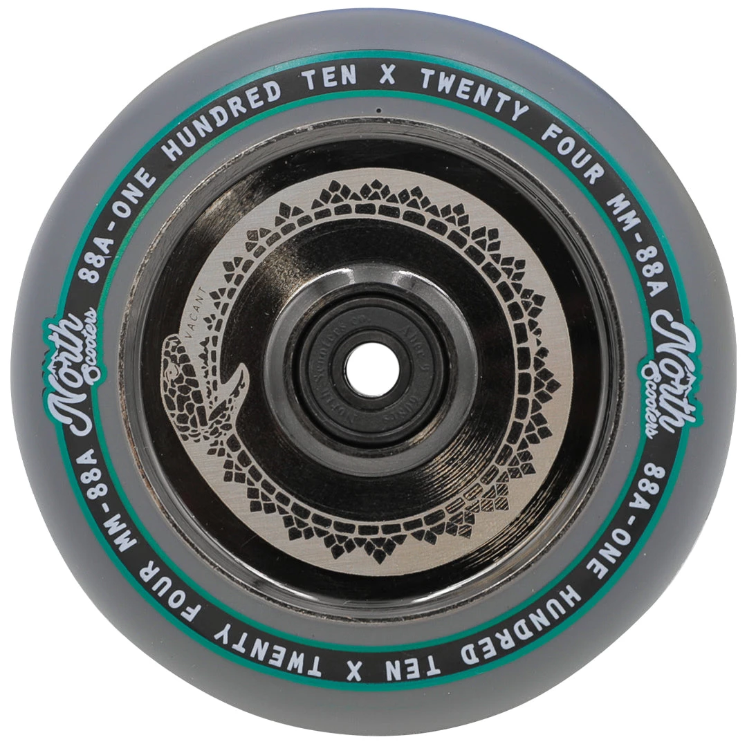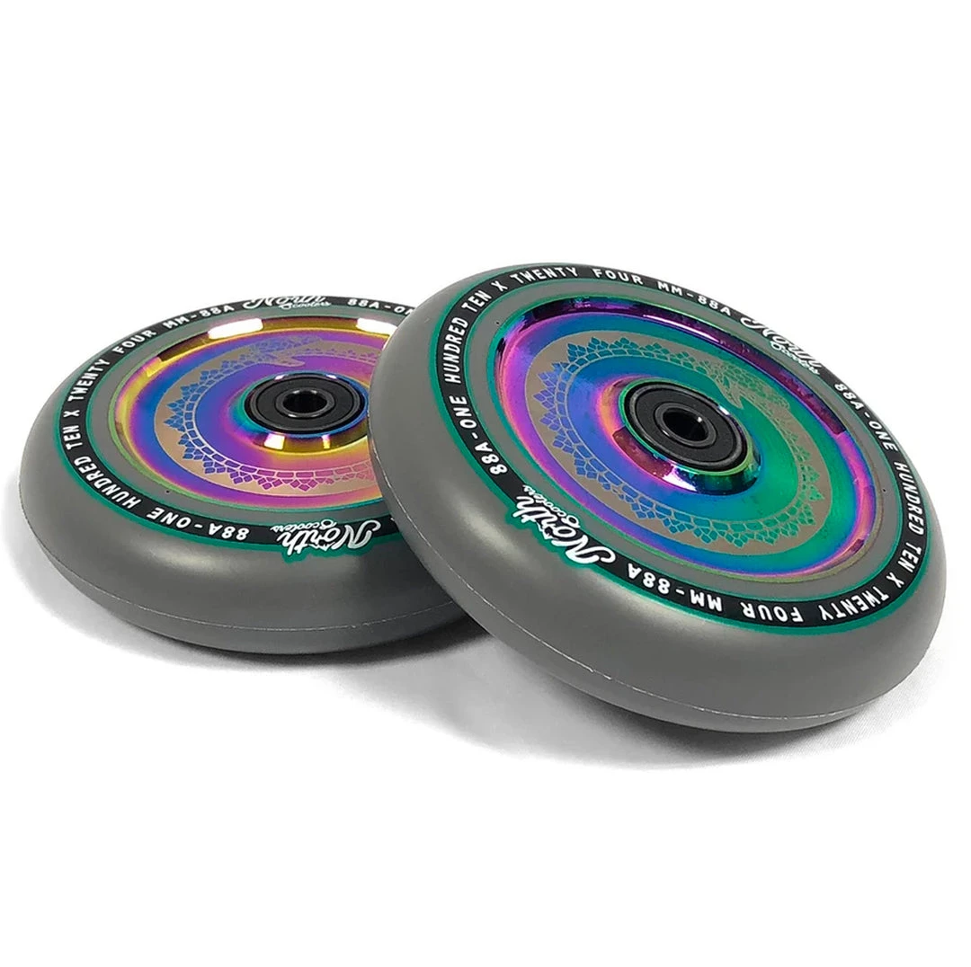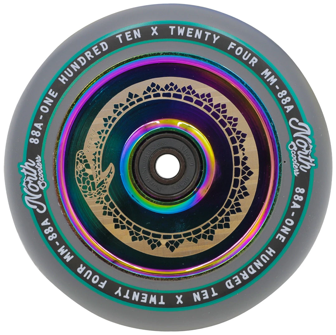 North scooter wheels have proven to be some of the fastest scooter wheels as well as the smoothest that we have ever seen. This 110mm x 24mm North Vacant scooter wheel keeps a low-key look to any scooter but performs incredibly. The North Vacant Wheel feature hollow core technology making them extremely light. These hollow cores paired with an 88a high rebound urethane make for a scooter wheel that is both lightweight and durable. These wheels come equipped with North’s ABEC9 bearings to keep your rolling for as long as possible. A vailable in silver, rose gold, oil slick, matte black & black chrome core color options If you’re looking to get one of the best scooter wheels in scootering, grab your North Vacant wheels today at Scooter Zone!