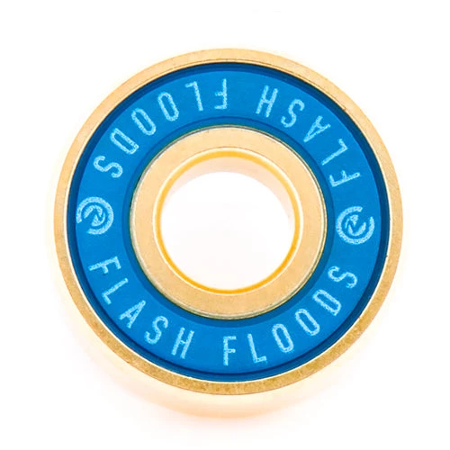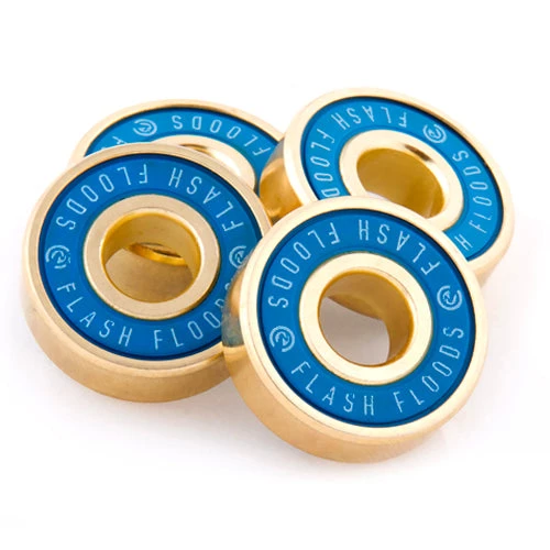 The River Flash Flood Bearing. A Complete set including 4 bearings and 2 bearing spacers. These bearings have a gold outer shell with bright blue bearing shield / casing and are rated at an ABEC 7 rating. If you’re running a quality scooter wheel like the River wheels, grab some fresh bearings and keep that speed.