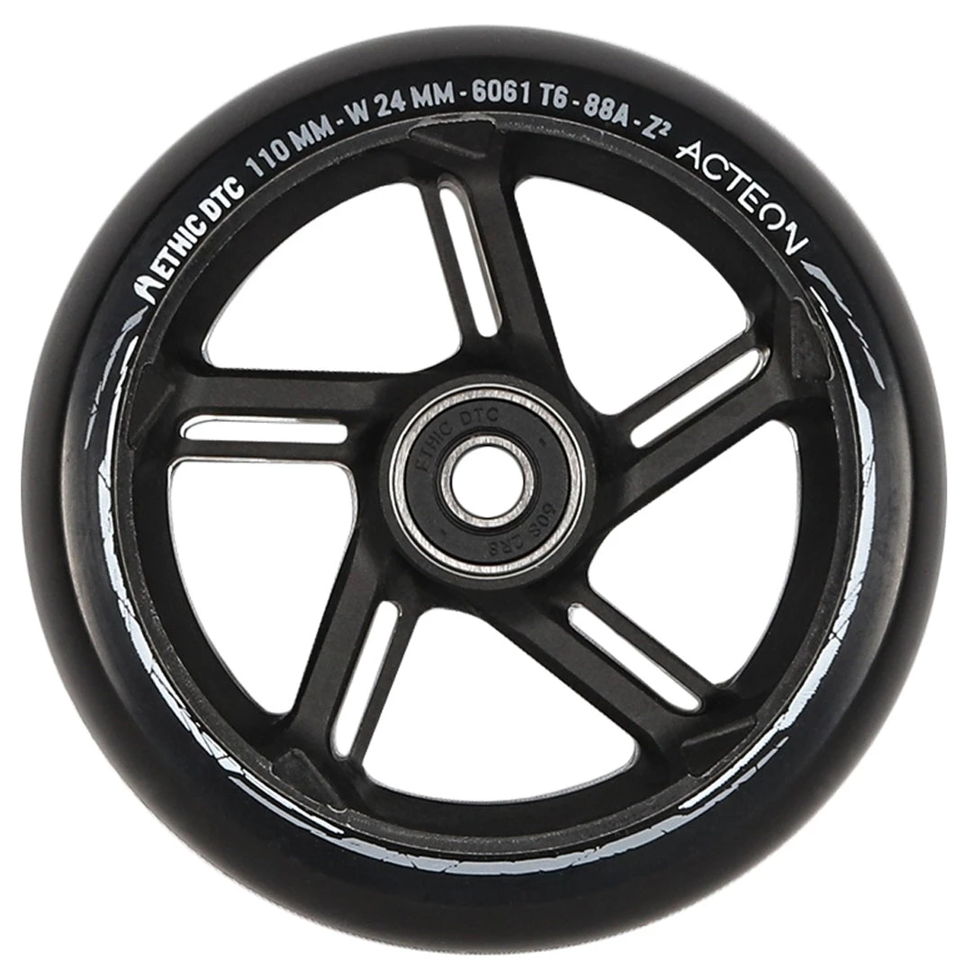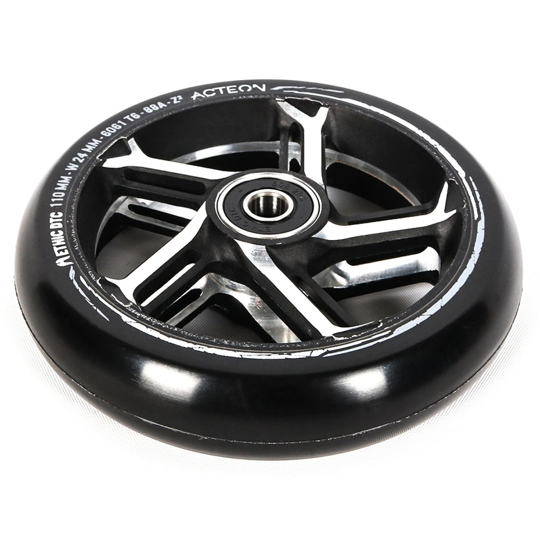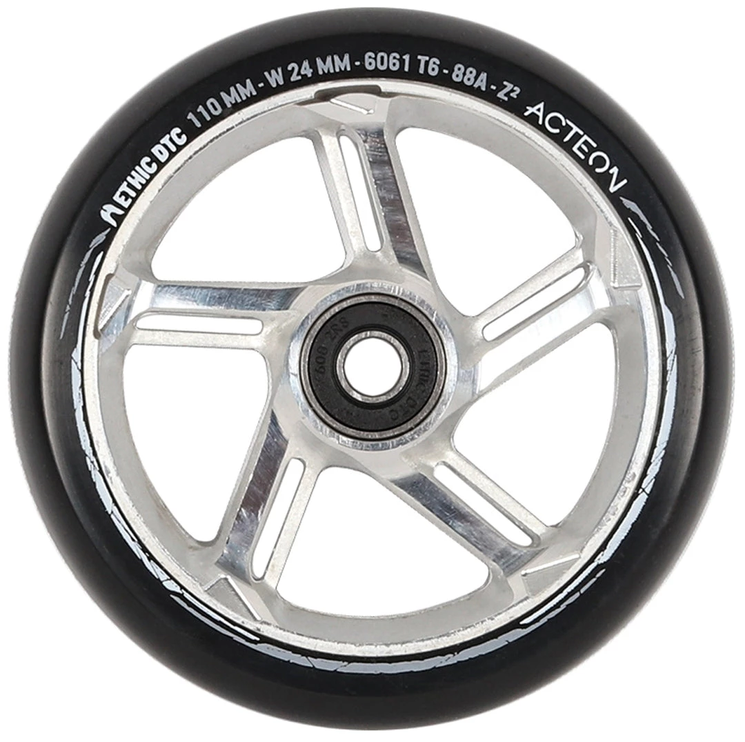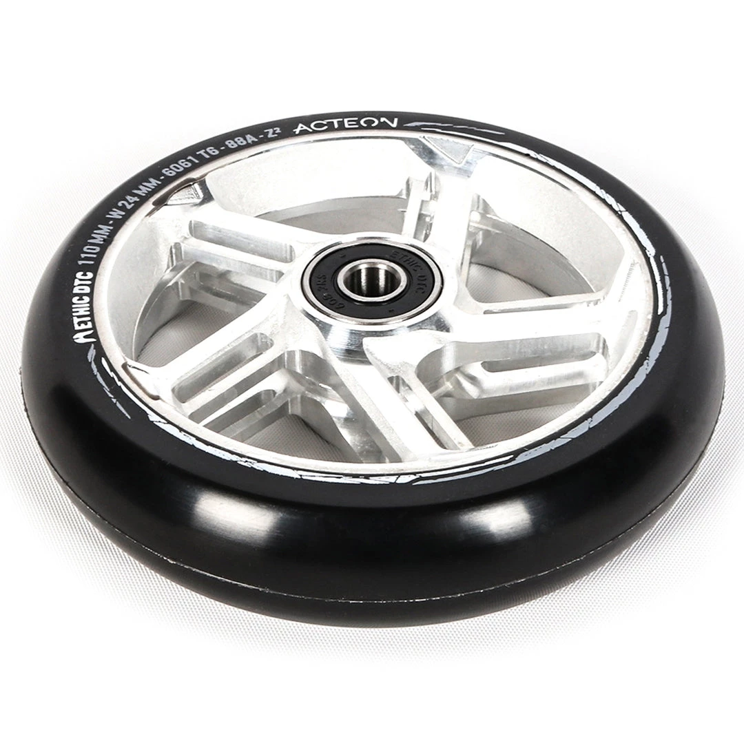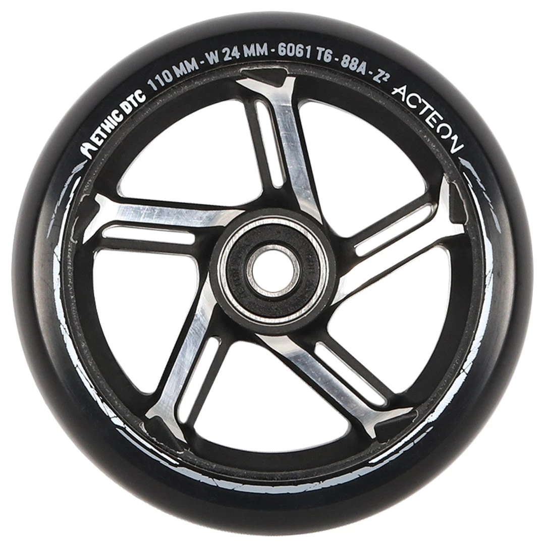 Ethic’s Acteon wheel is one of the most unique pro scooter wheel designs in the world. This wheel is made with a forging process and then CNC machined to make the beautiful core that you see here. The 10 spoked design is incredibly original and is sure to get tons of eyes on any custom scooter or out of the box complete. This wheel is available in black, oil slick, raw & black / raw options. Grab your Ethic Acteon wheels and get your scoot looking right!