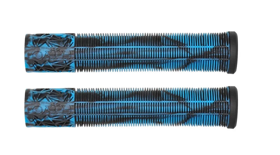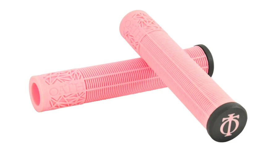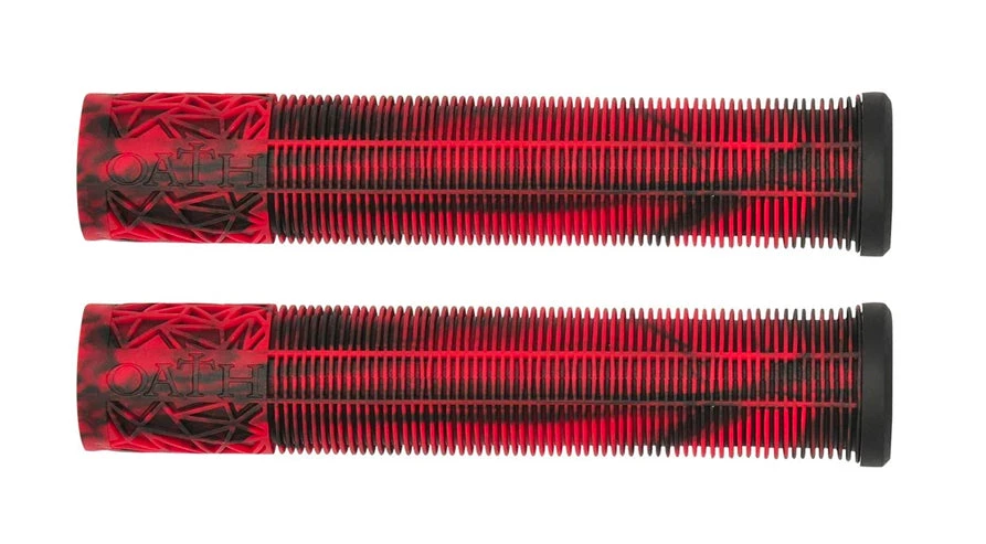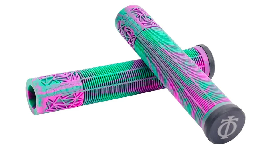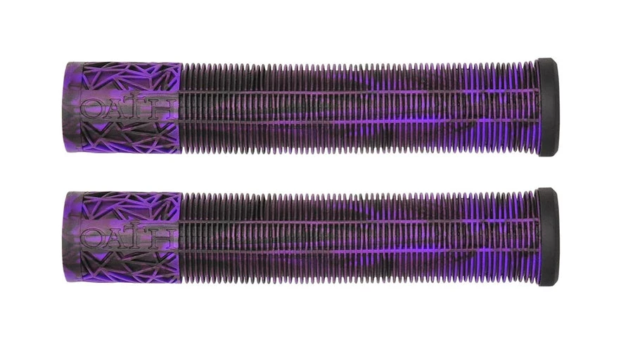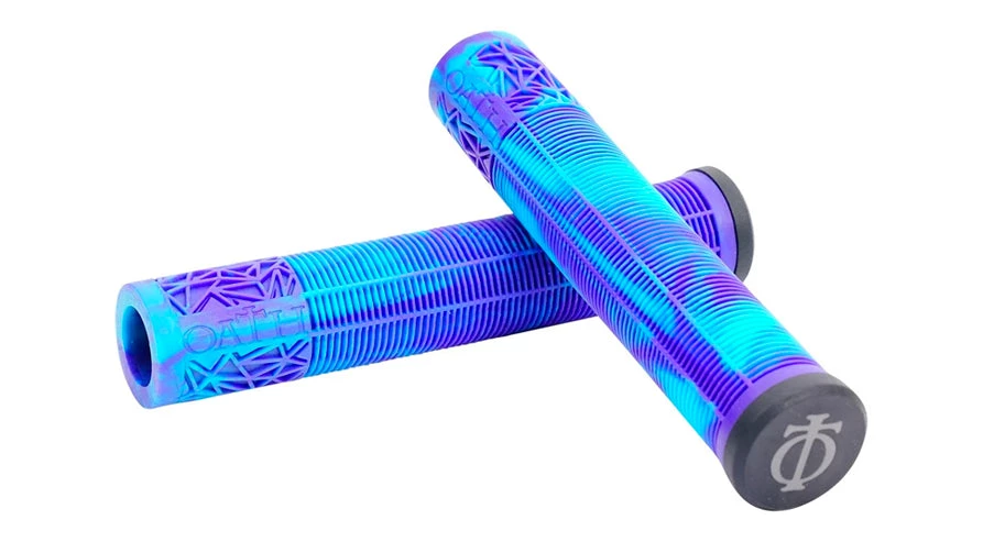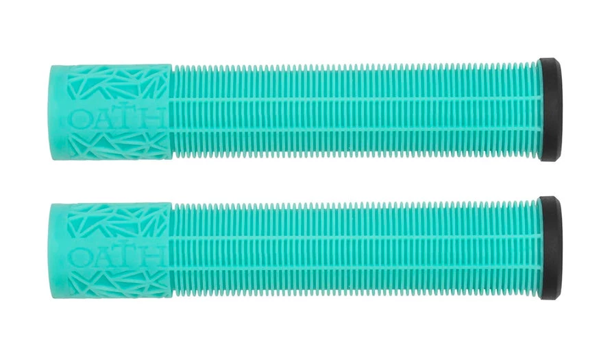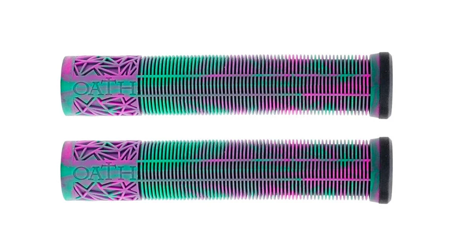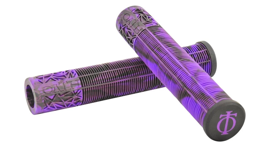 Introducing the Bermuda grip, a two way feeling grip which keeps your hands in position and ready to trick. It has deep grooves for a vast amount of grip and creates less sweaty hands. It then transitions into the Oath Bermuda triangle pattern which riders can utilize to bar-spin. Slightly over sized in diameter to give extra cushioning on those big landings. The grip is 165mm in length and comes with two sets of different sized bar ends (1 for steel and 1 for aluminum). A wide color range from traditional black to pastels to two tone marble! Super Soft, yet durable TPE material. 2 sets of TPR dual injected bar ends.