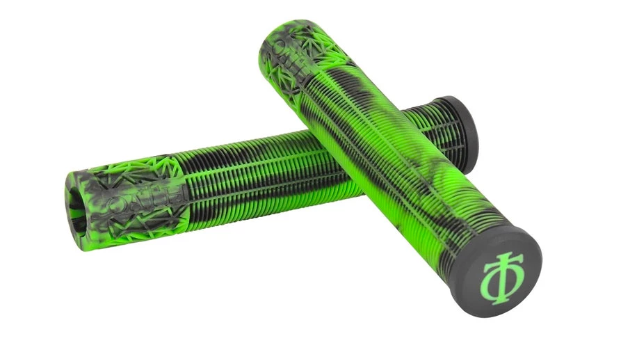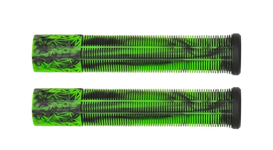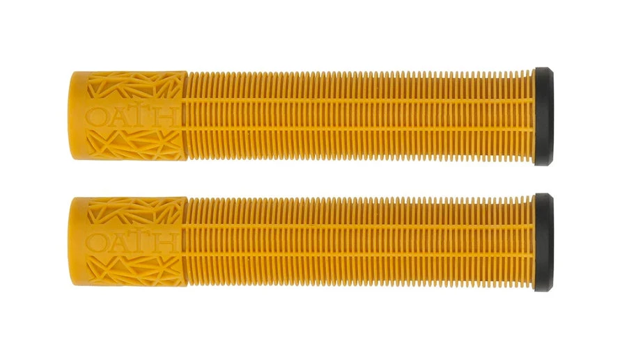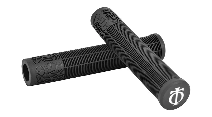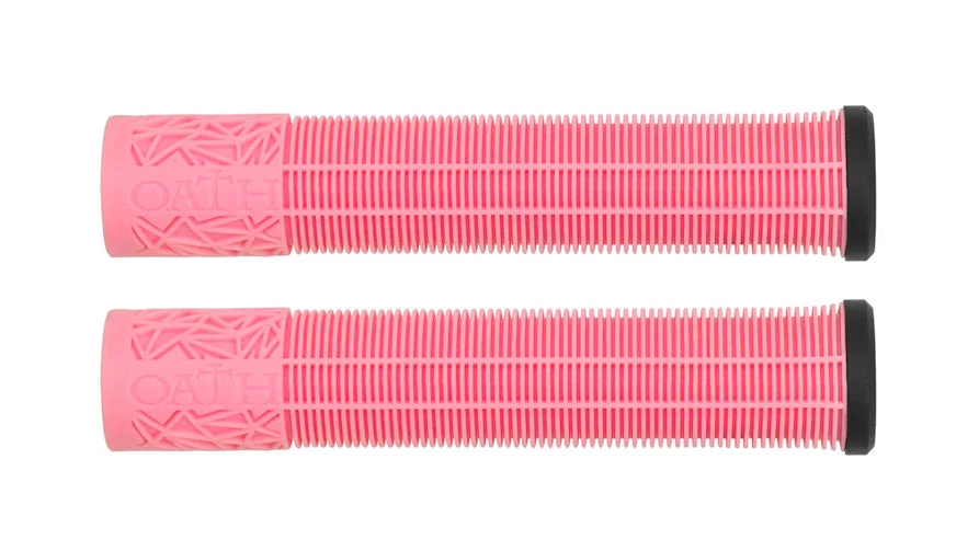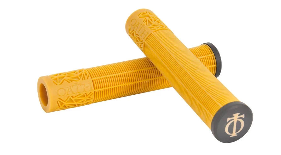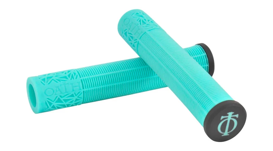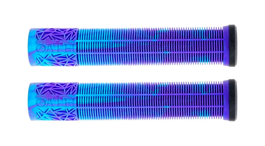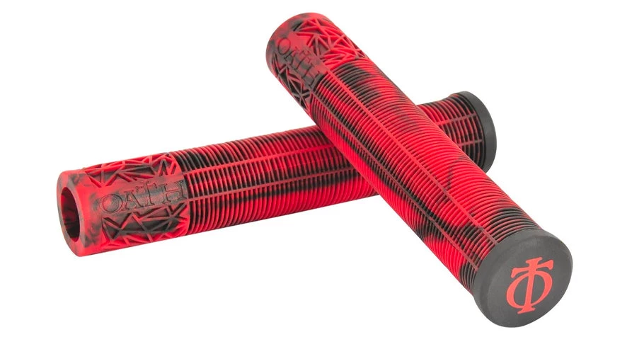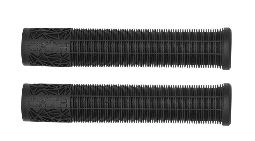 Introducing the Bermuda grip, a two way feeling grip which keeps your hands in position and ready to trick. It has deep grooves for a vast amount of grip and creates less sweaty hands. It then transitions into the Oath Bermuda triangle pattern which riders can utilize to bar-spin. Slightly over sized in diameter to give extra cushioning on those big landings. The grip is 165mm in length and comes with two sets of different sized bar ends (1 for steel and 1 for aluminum). A wide color range from traditional black to pastels to two tone marble! Super Soft, yet durable TPE material. 2 sets of TPR dual injected bar ends.