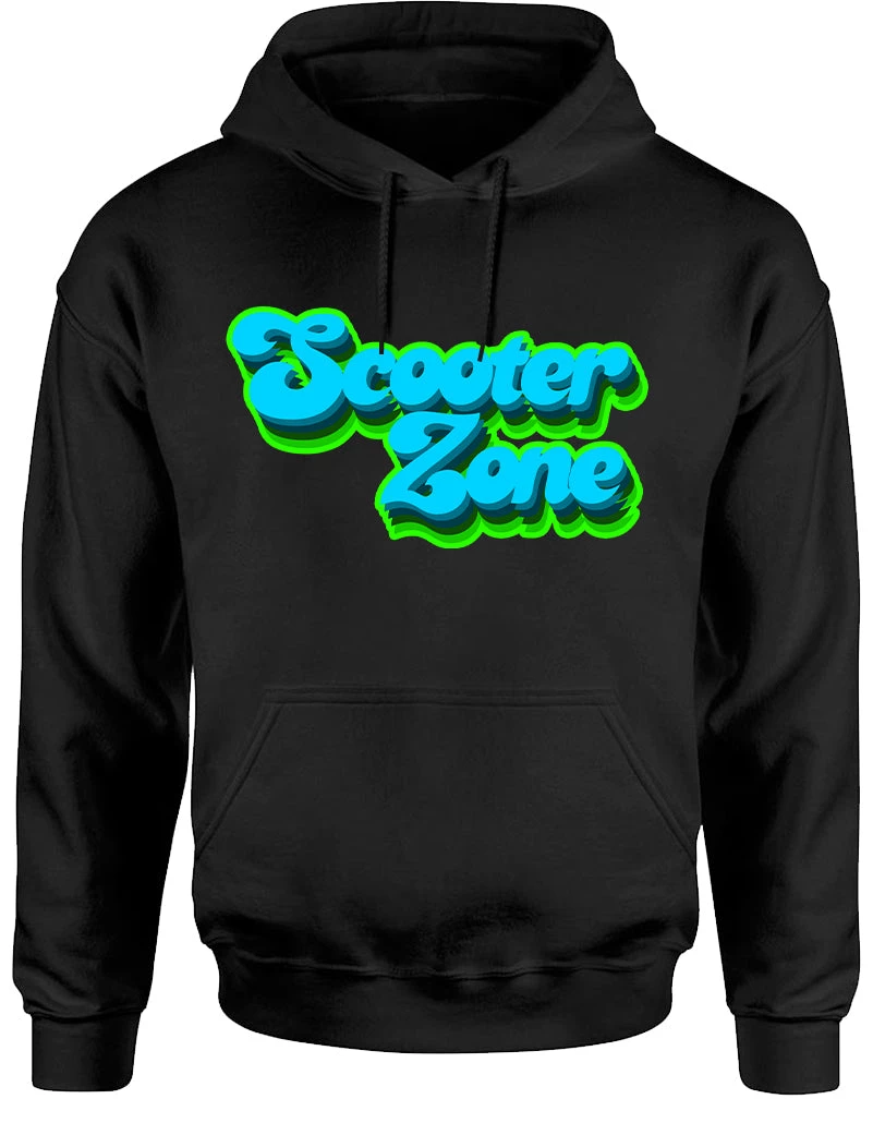 Cold out where you are? Grab yourself a Scooter Zone hoodie today! This particular hoodie features our new ‘Groovy’ logo in a blue & green color way. This hoodie features a standard fit, jersey lined hood, front pouch pocket and soft material. Available in Adult XS, Adult Small, Adult Medium, Adult Large & Adult XL.