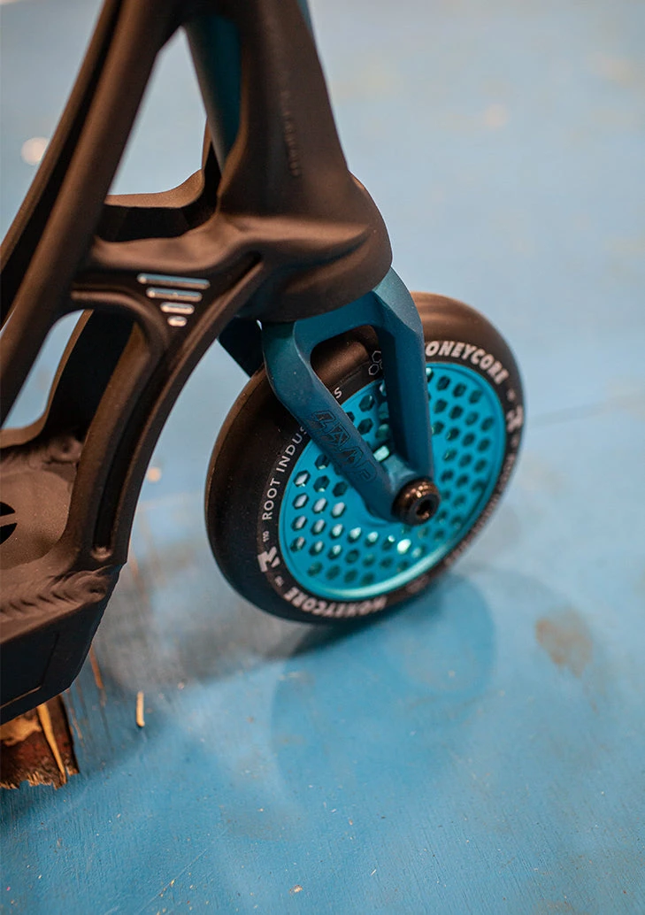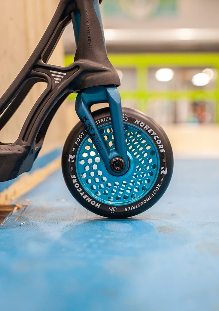 - 110mm x 24mm Root Industries Honeycore Wheels in Black on Sky Blue
